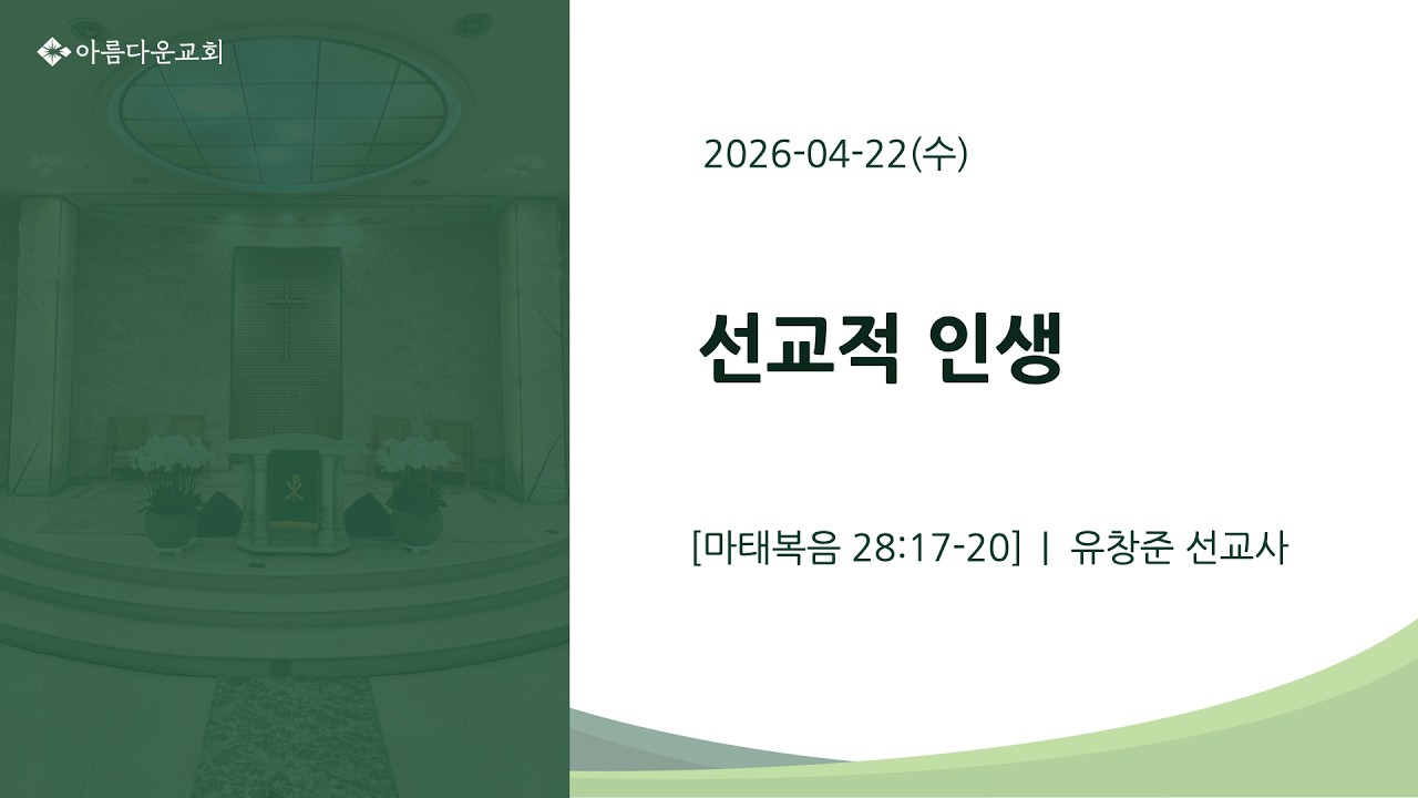 | 공지 | 구원(2) 새로운 경영 | 아름다운교회 | 2026-03-25 | 97 | |